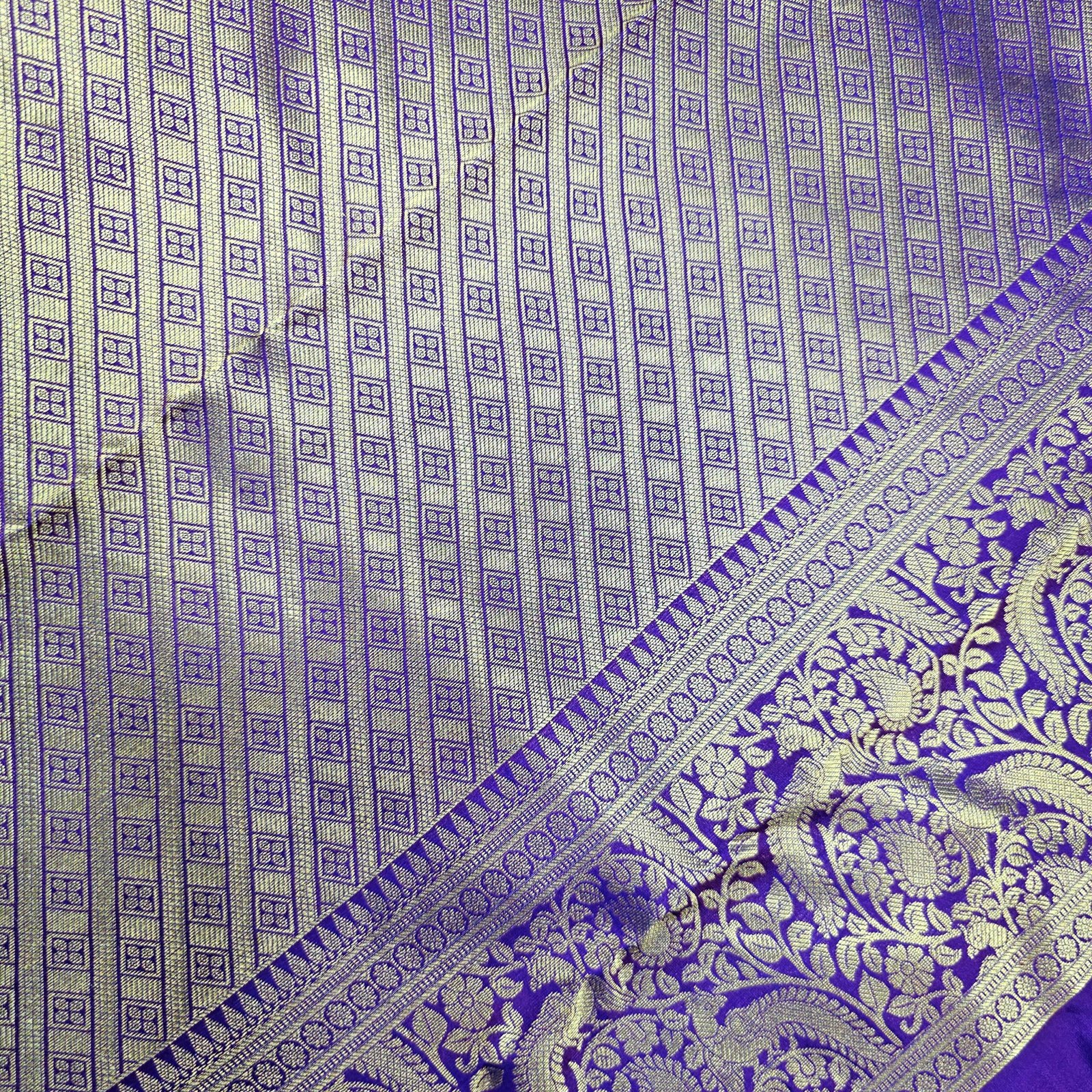 - Fabric: Likely Kanjivaram or Banarasi silk based on the richness of the weave and shine