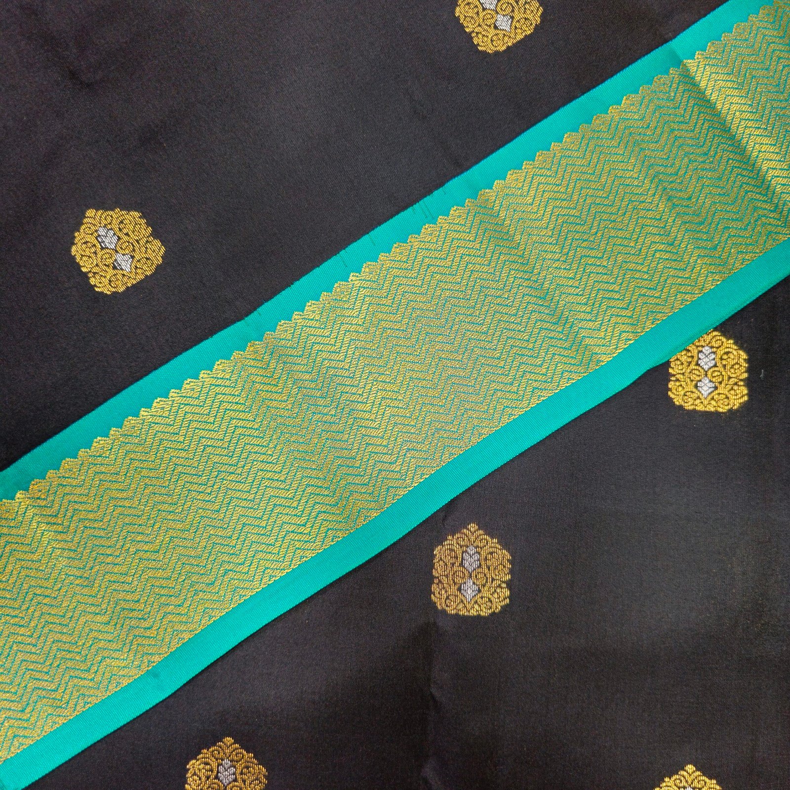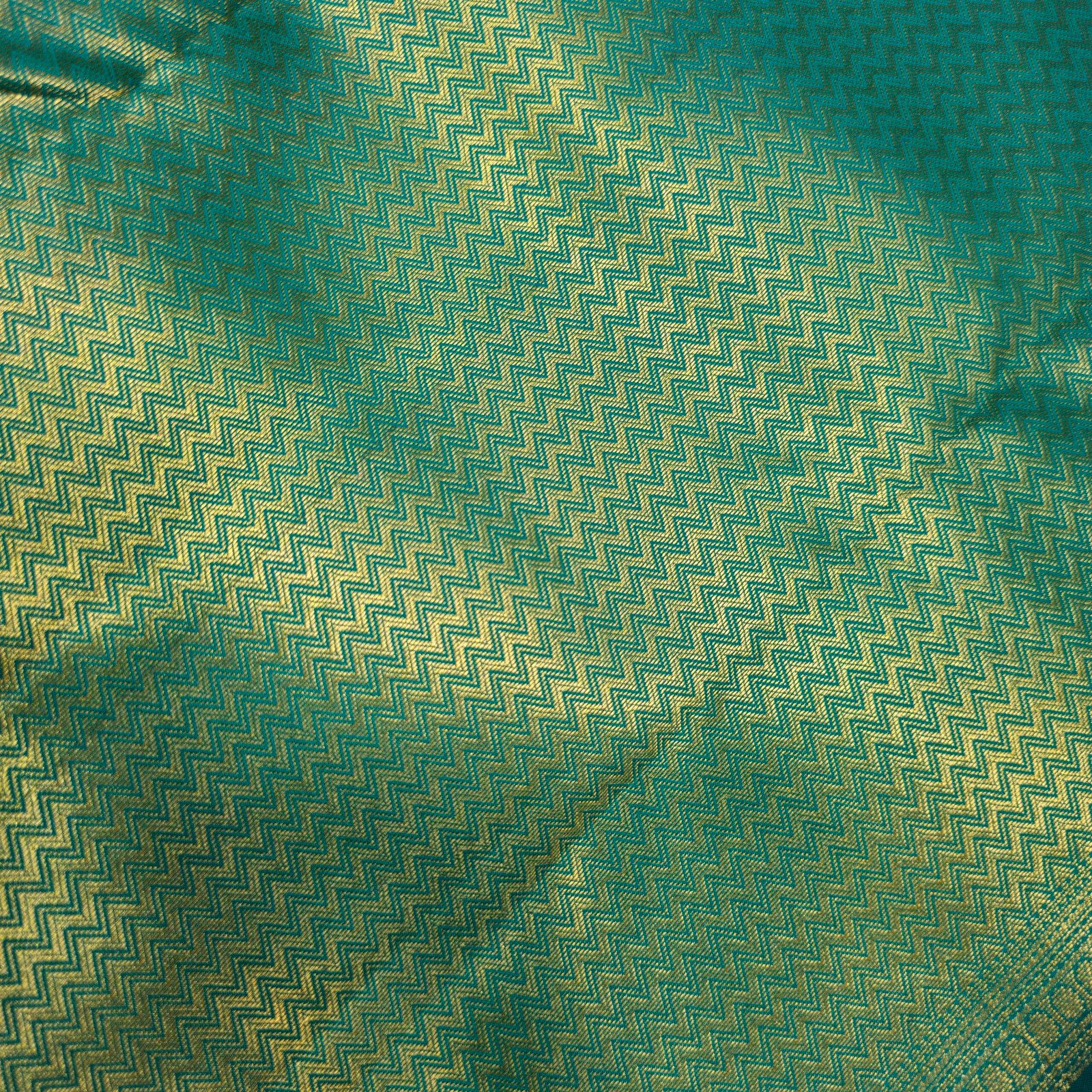 - Border: Features a green border with golden zari work, showcasing a chevron or wave-like pattern. A fine turquoise piping further highlights the edges.