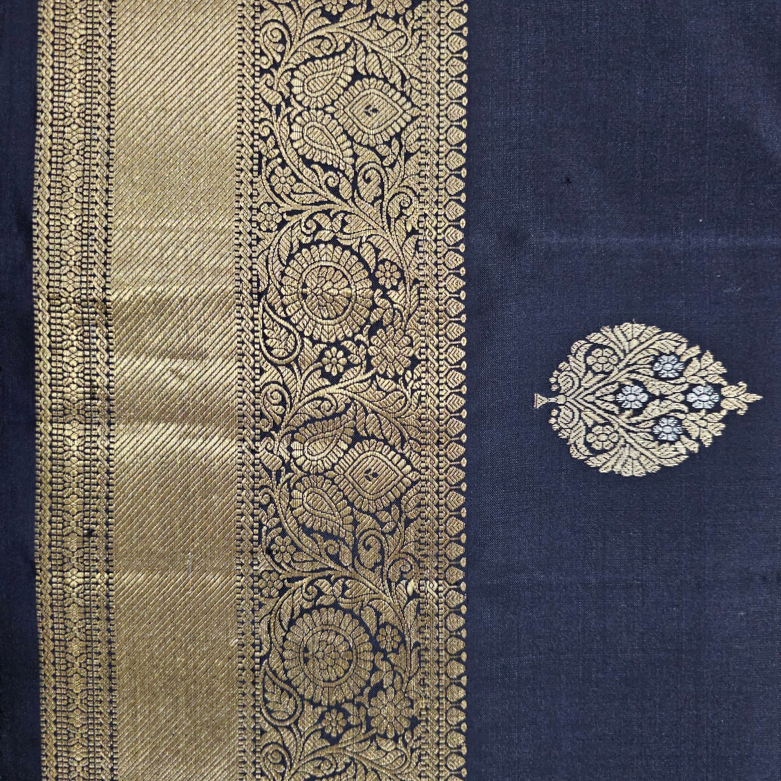 The saree in the image appears to be a Banarasi silk saree, characterized by its rich golden zari work and intricate motifs. The color of the saree looks like a midnight blue or navy blue with gold zari detailing.