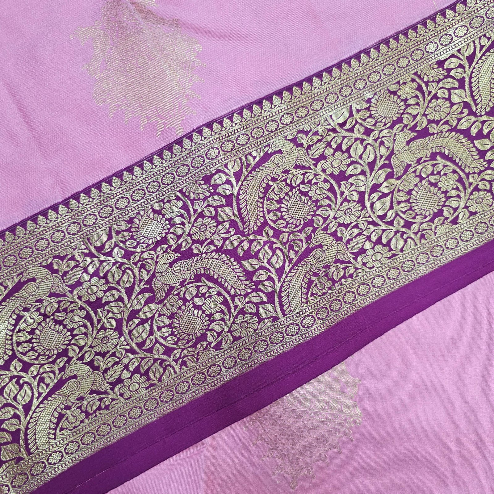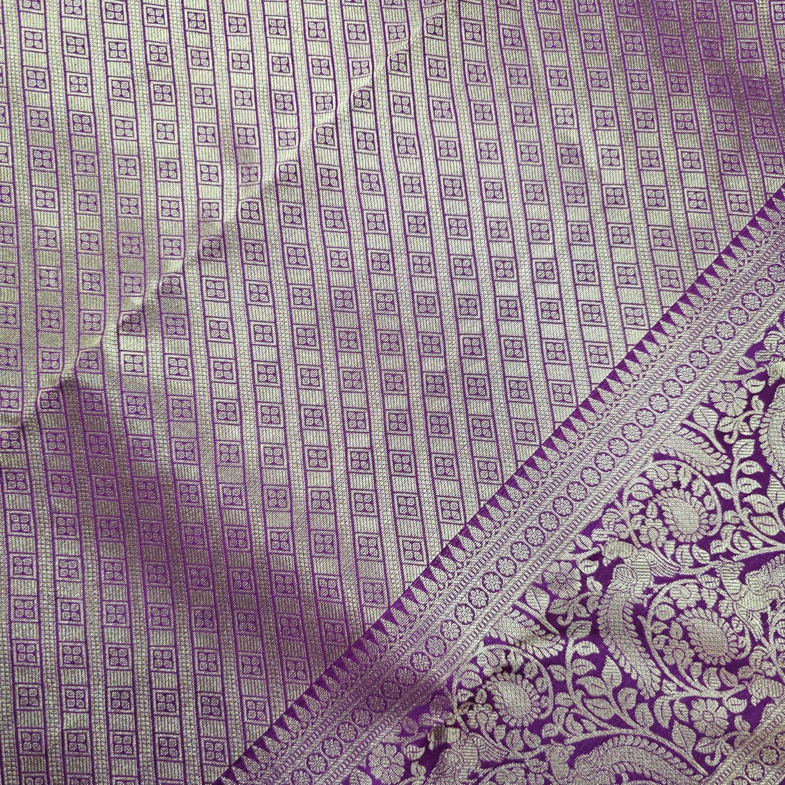- Border and Pallu: A striking royal purple border and pallu, lavishly woven with gold zari work. The border features elaborate floral and vine motifs, while the pallu includes detailed geometric diamond patterns interspersed with floral elements, showcasing meticulous craftsmanship.