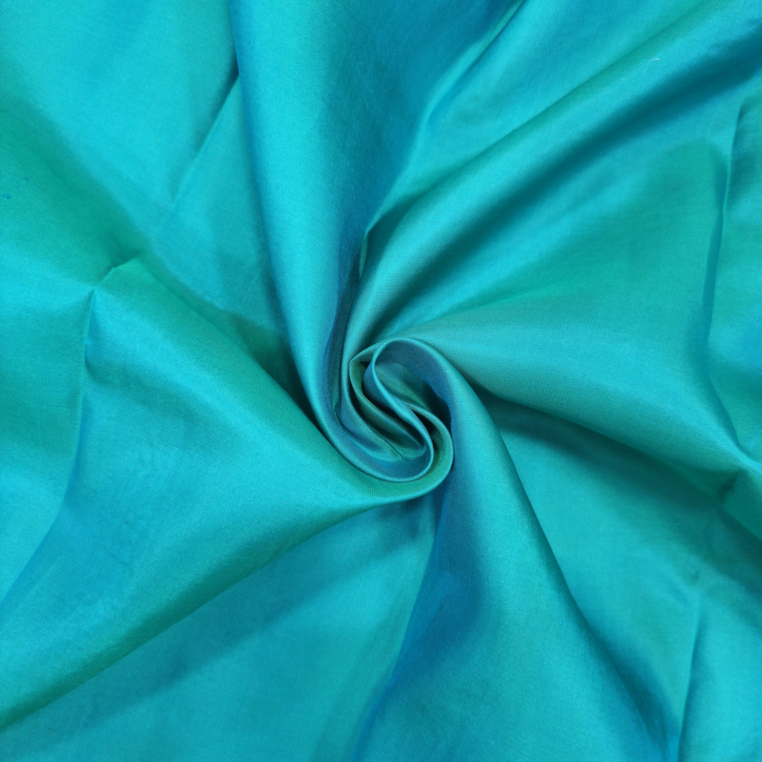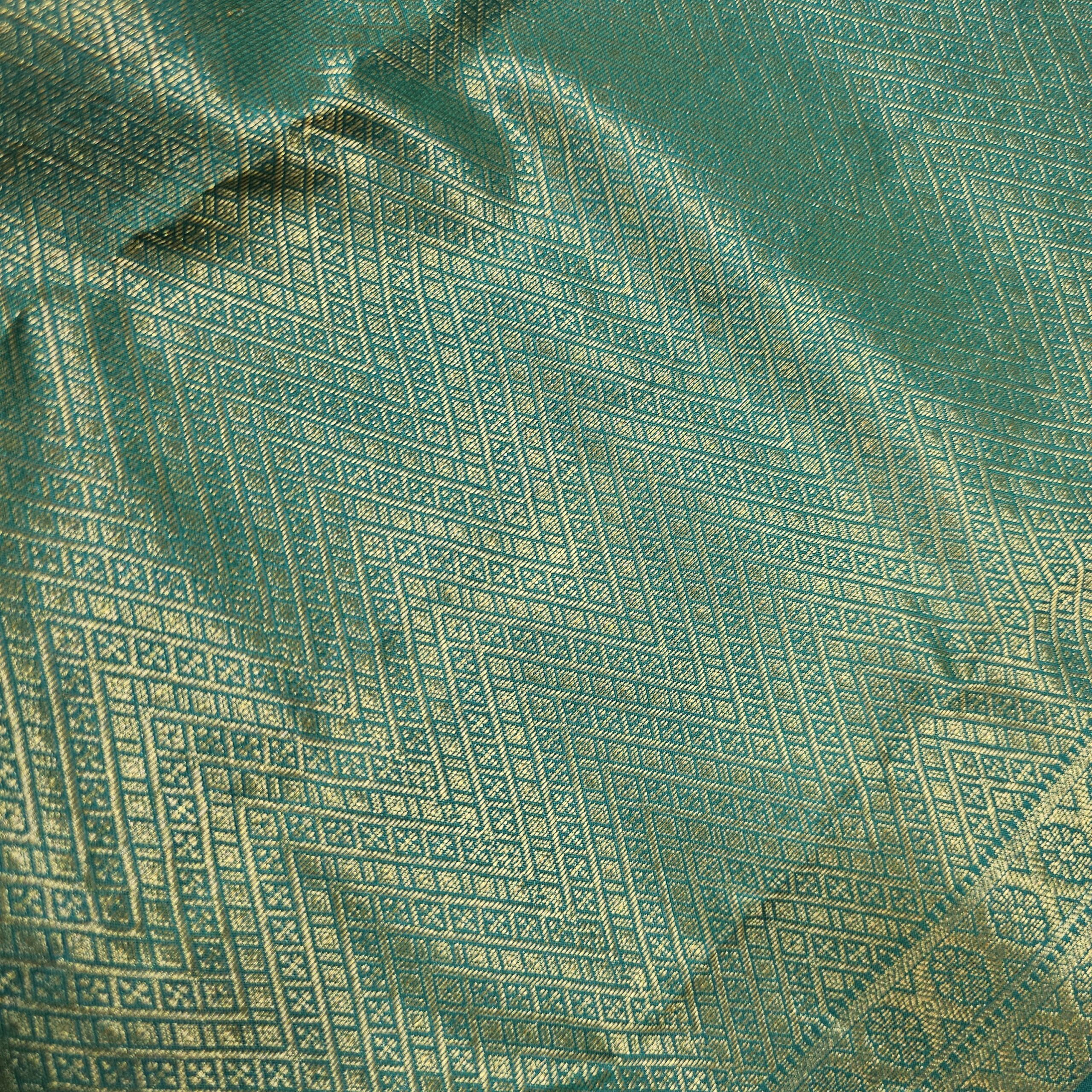 • Border and Pallu: A contrasting teal green border and pallu featuring intricate gold zari weaving in traditional patterns, framed with a thin dark green piping that adds a sharp, refined finish.