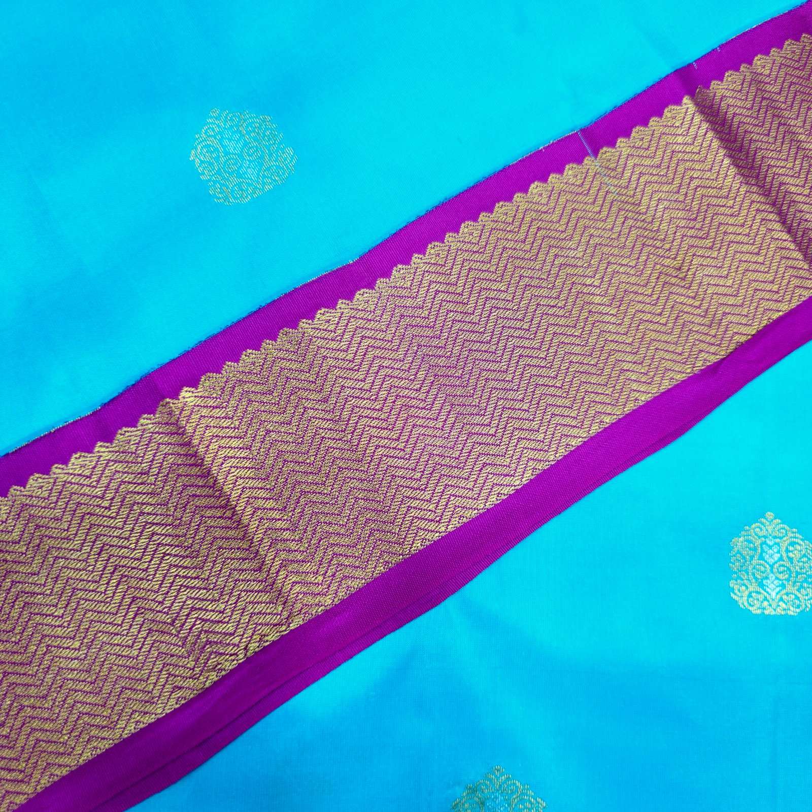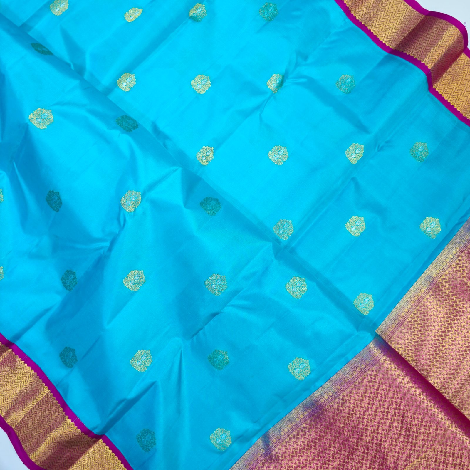This saree is a bright sky blue silk saree with golden motifs and a contrasting pink and gold zari border.